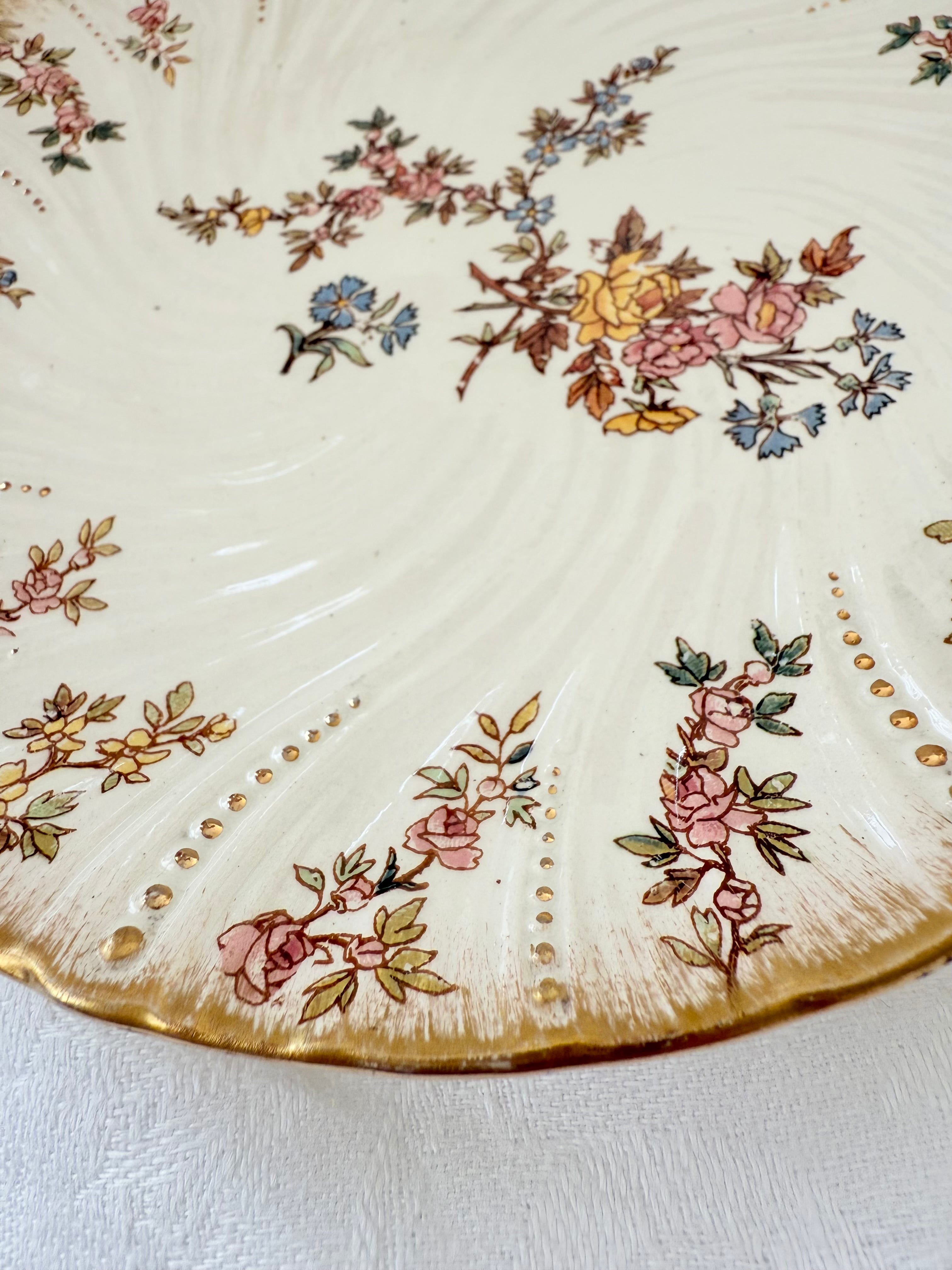 サルグミンヌU&C時代の古いお品。金色の縁取りが煌びやかで、またレリーフも繊細で美しい逸品です。色使いもあたたかで、淡いパステルカラーが多用された"ロココ"スタイルを表しています。可愛らしく女性的で繊細優美な雰囲気は、フランスの貴婦人たちに愛されたルイ15世のスタイルです。