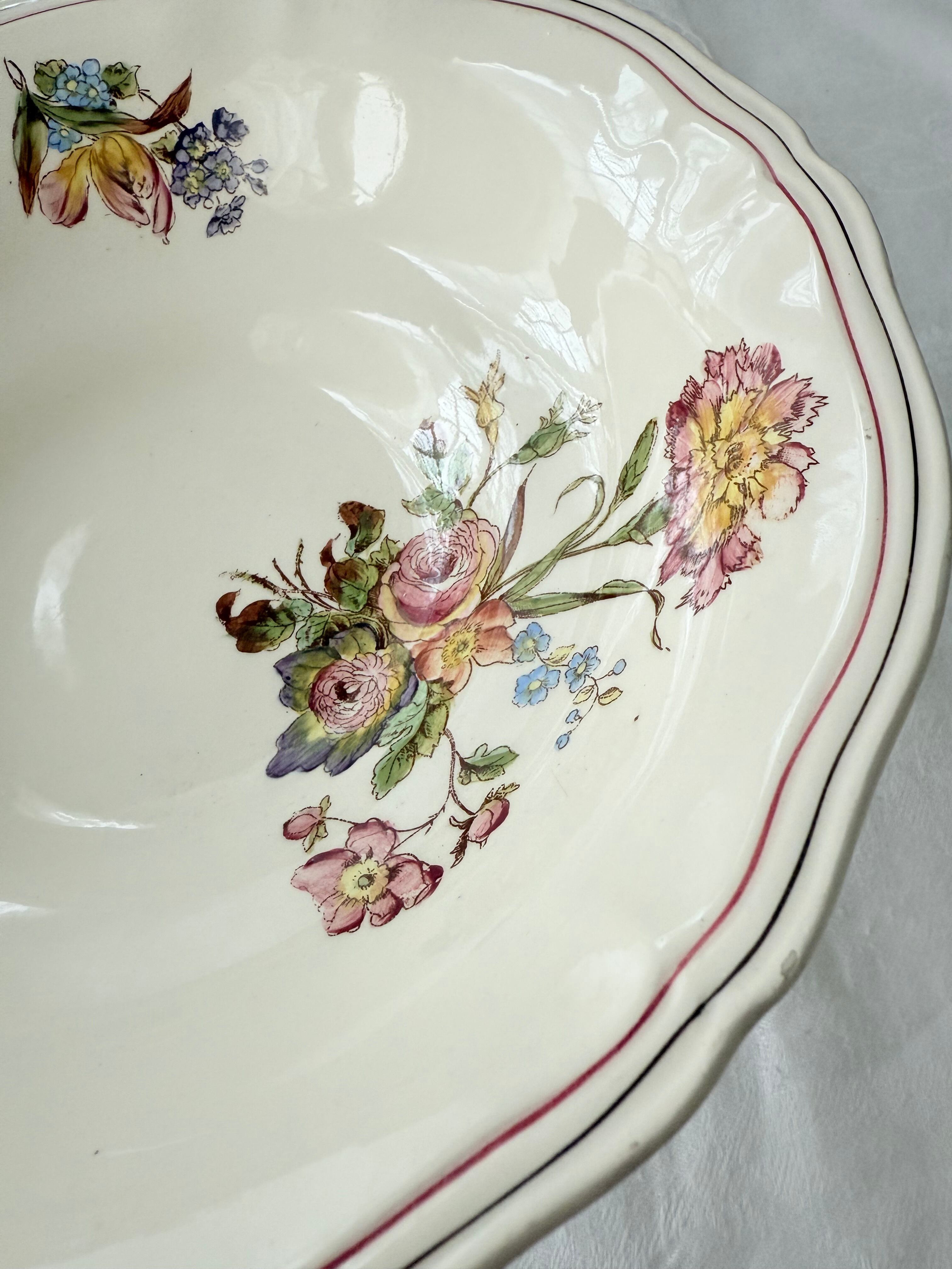 クリームがかった素地に、淡く愛らしい花々が手描きのように彩られ、リムには繊細なローズピンクとブラウンのラインがそっとアクセントを添えています。