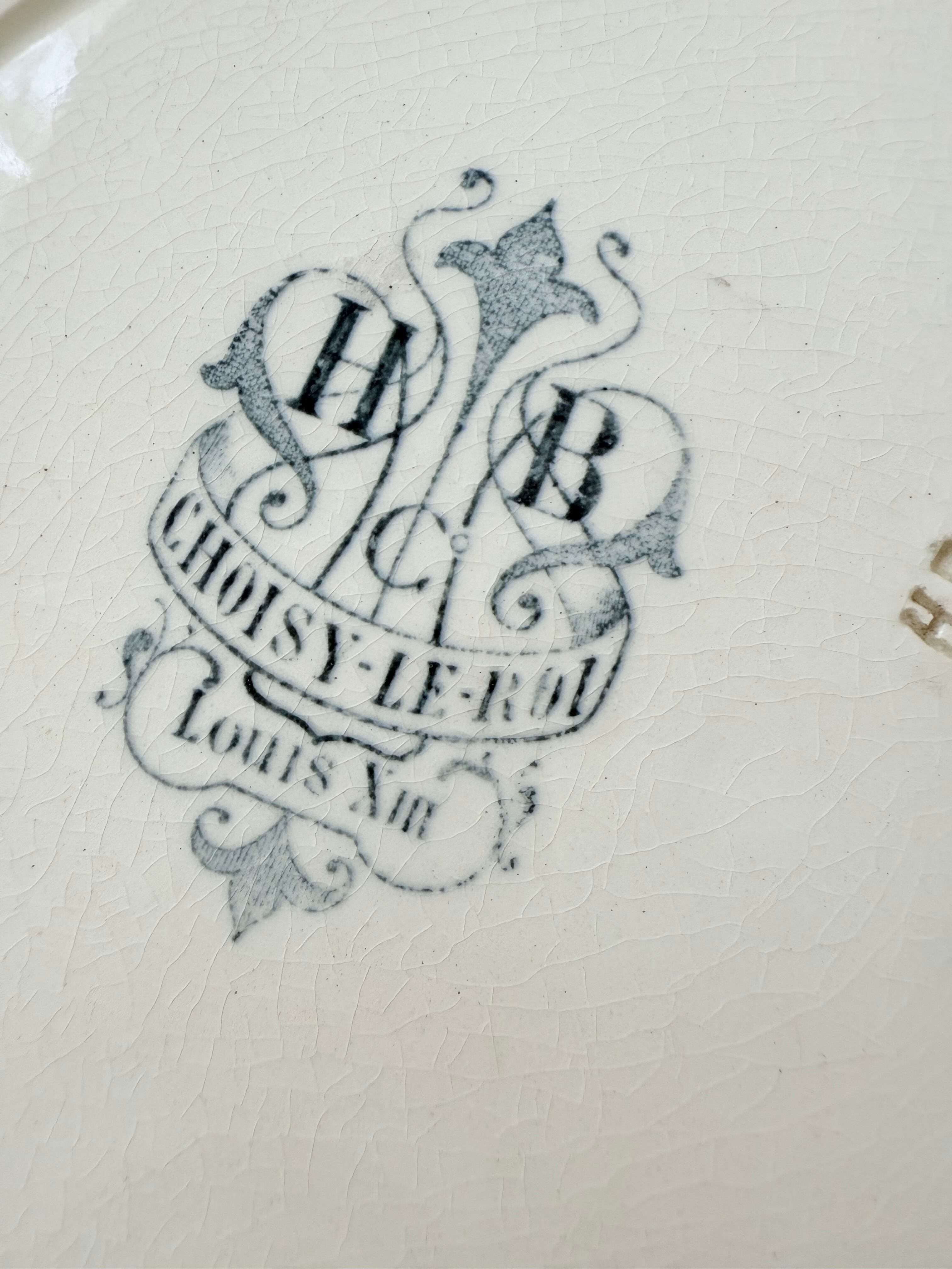 裏面には「HB&Cie Choisy-le-Roi」の刻印が入り、Hippolyte Boulenger & Cieによって製造されたことを示しています。ショワジー=ル=ロワは、フランスを代表する陶器メーカーの一つとして知られ、繊細な絵付けと優雅な装飾で高い評価を受けています。