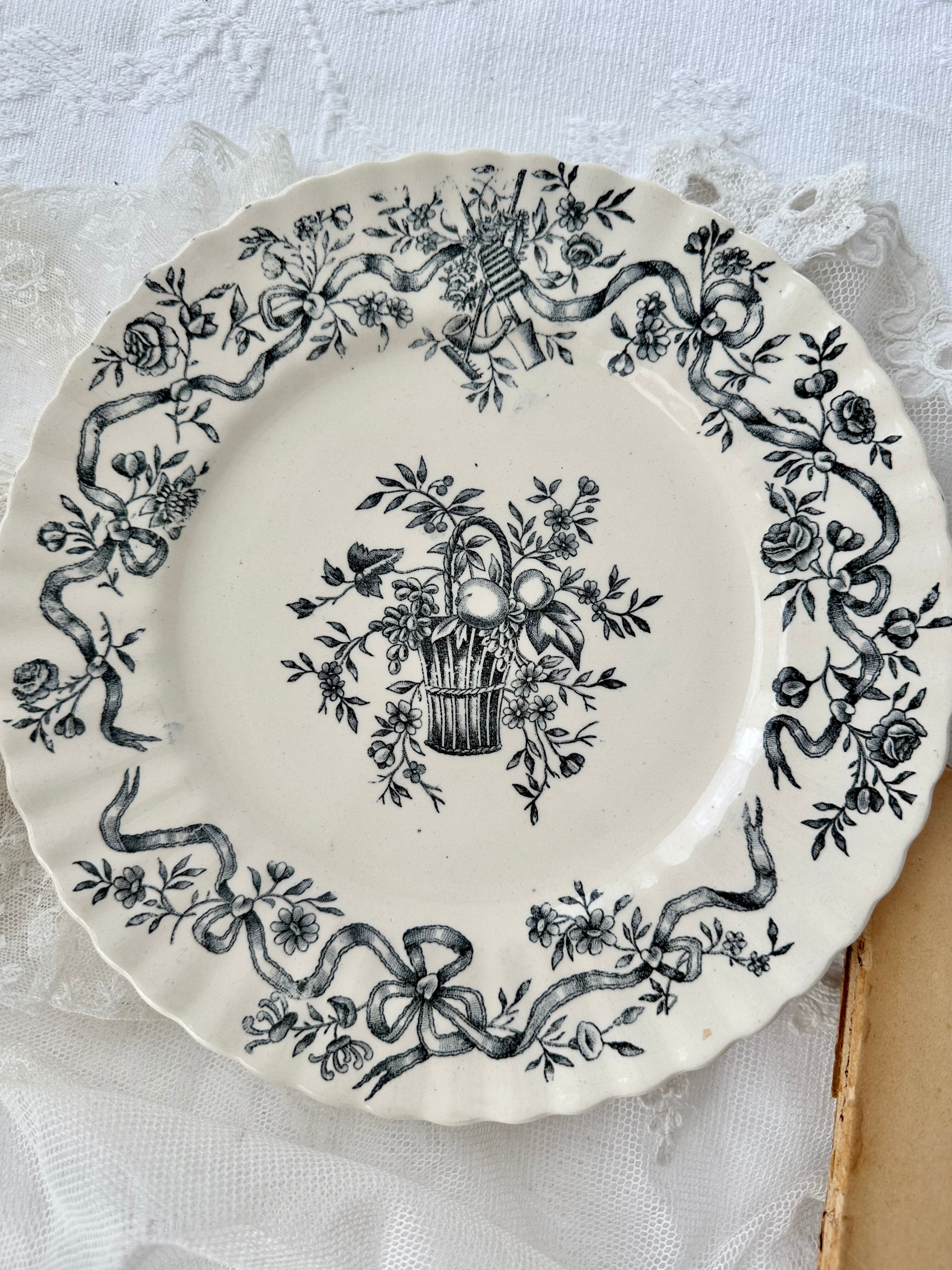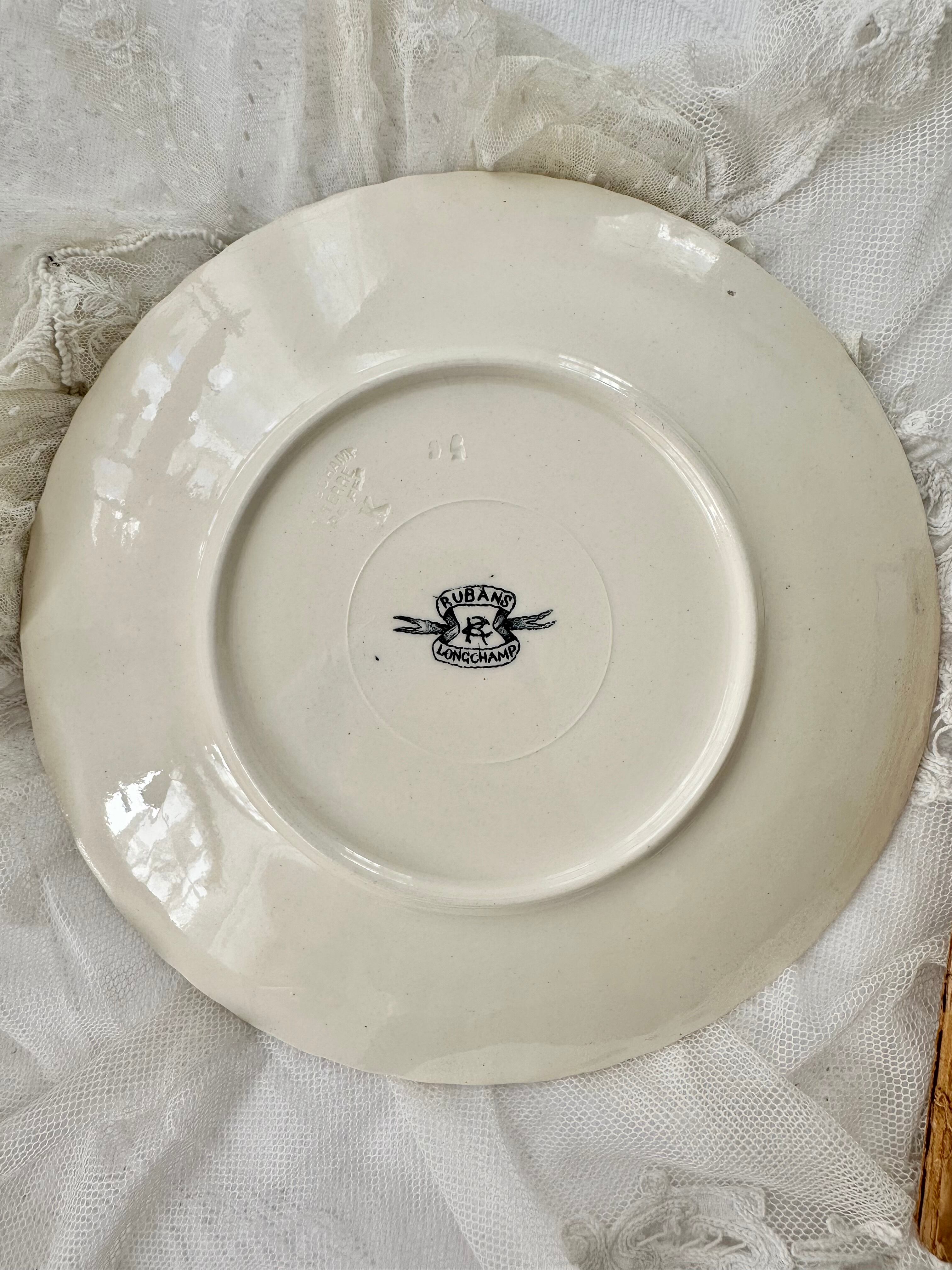 アンティークのフランス製陶器、ロンシャン モデル「Rubans」クリーム色、ダークブルーのブーケとリボンのデザイン、スカラップ リム。非常に良好なヴィンテージ コンディションです。カケやヒビ、貫入はありませんが、