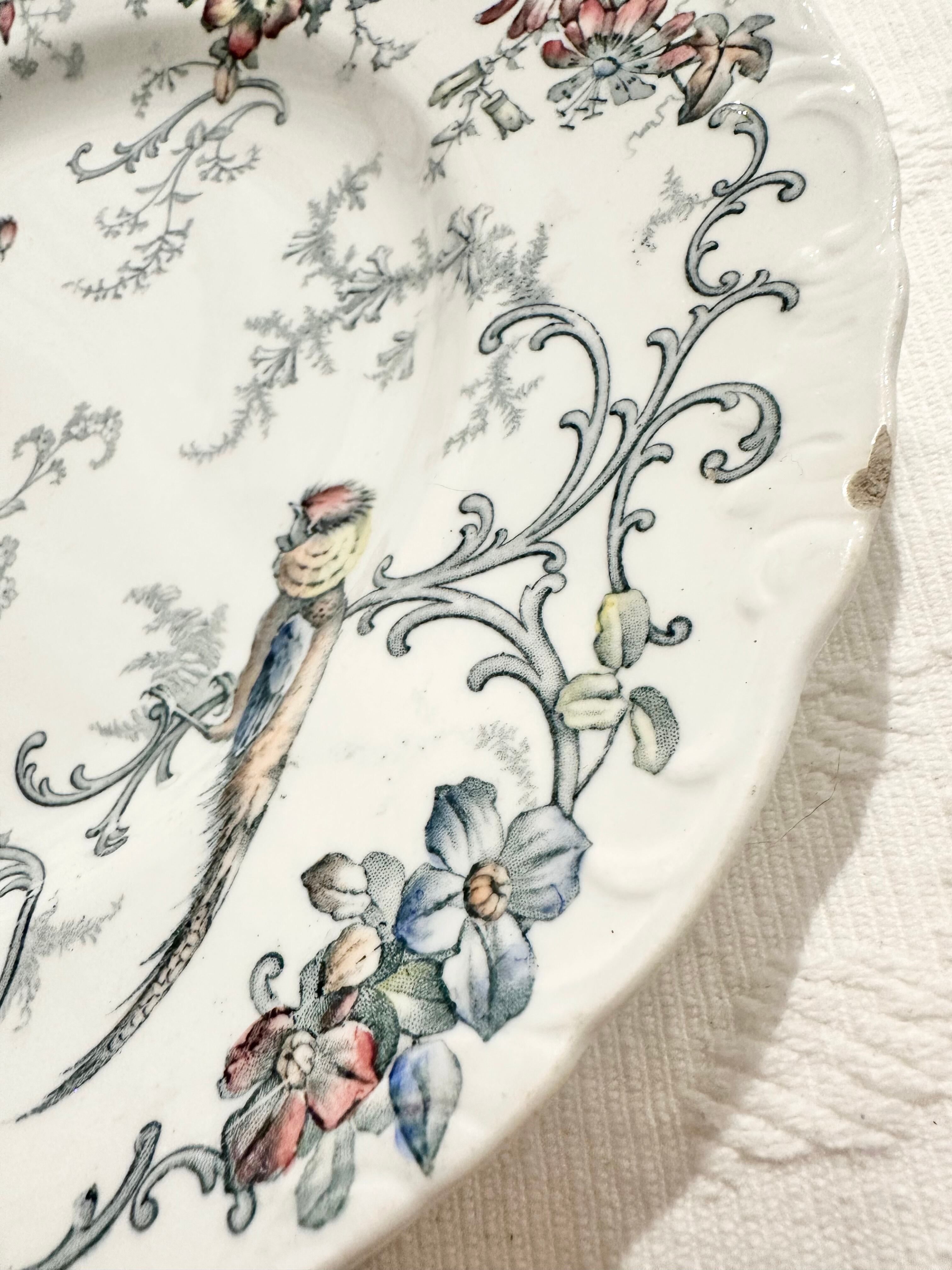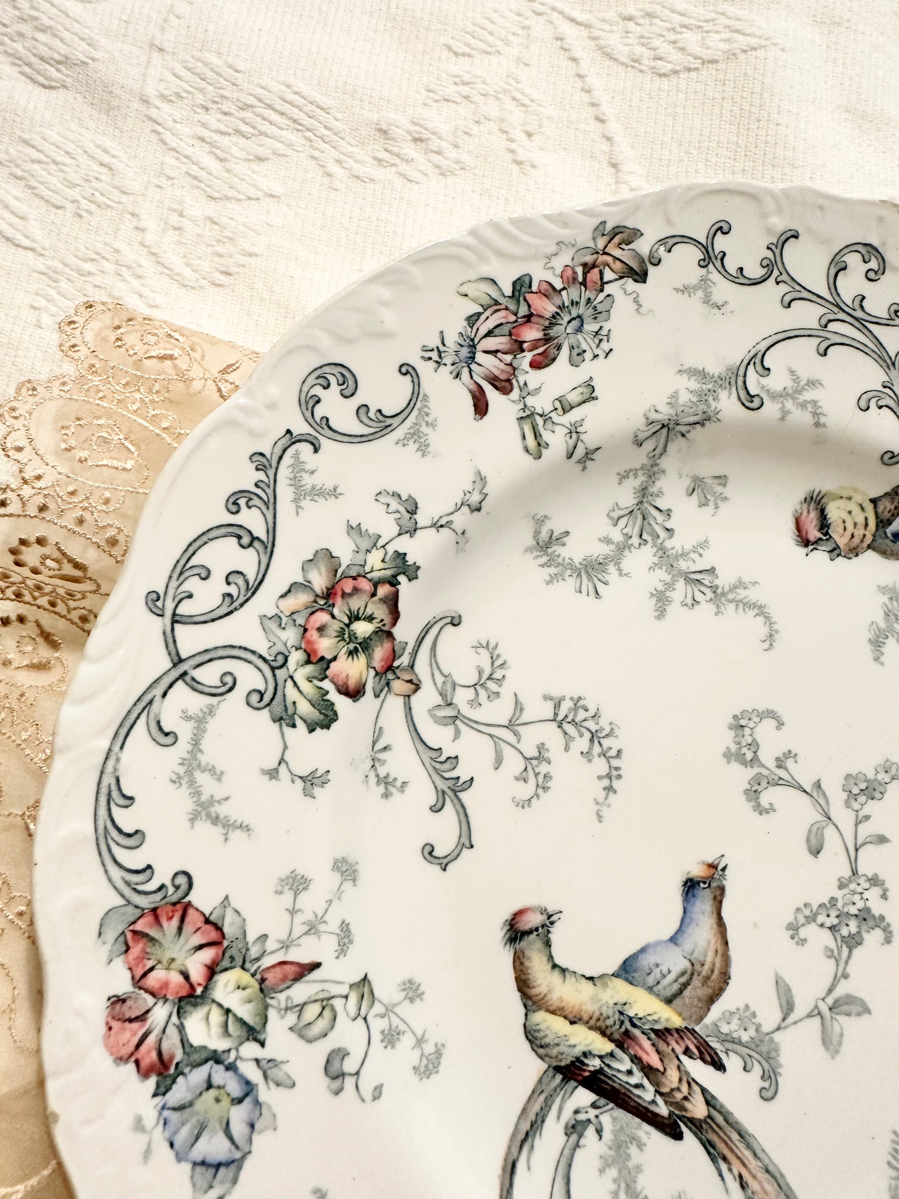 鳥やお花がロカイユのようなモチーフになっております。薄いブルーグリーンのベースに上品な色付けがなされています。