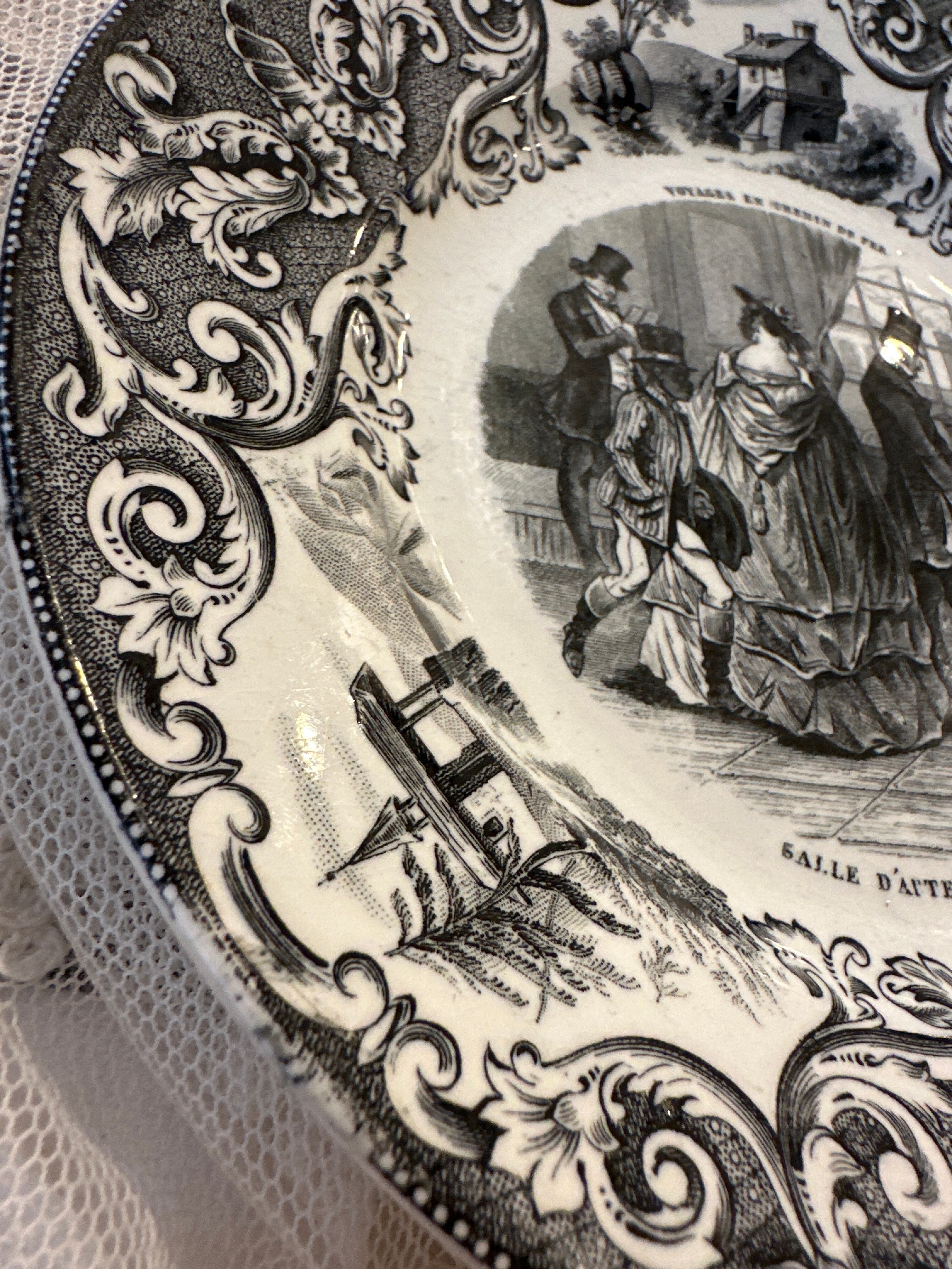 「Chemin de Fer(シェマン・ド・フェール)」という名前のアンティークのグリザイユプレートは、19世紀のフランスで人気があった装飾的な陶磁器の一部です。具体的には、「Chemin de Fer」という言葉はフランス語で「鉄道」を意味し、鉄道や旅をテーマにしたデザインが特徴的です。このようなプレートは、19世紀のフランスの社会的、技術的背景を反映しており、鉄道が急速に発展した時期に生まれたアート作品です。