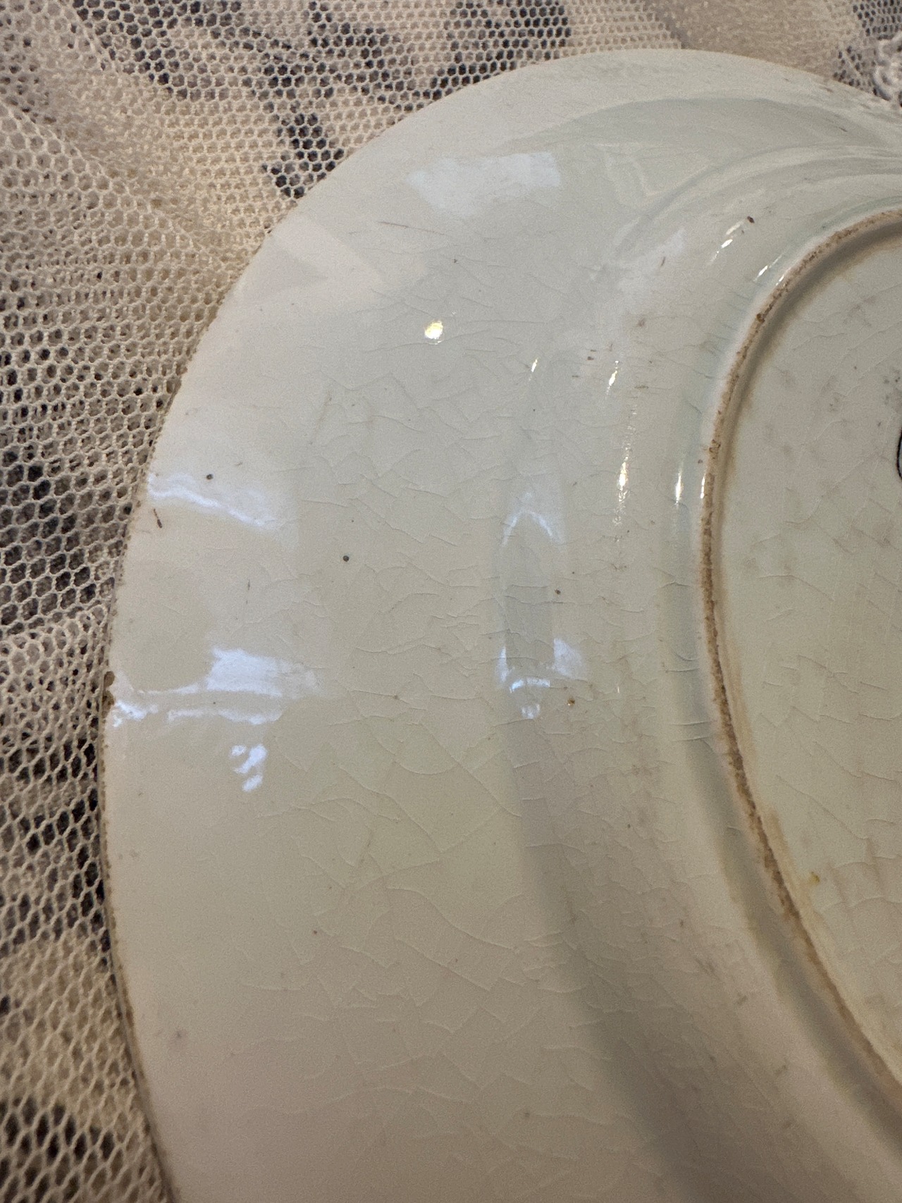 「Chemin de Fer(シェマン・ド・フェール)」という名前のアンティークのグリザイユプレートは、19世紀のフランスで人気があった装飾的な陶磁器の一部です。具体的には、「Chemin de Fer」という言葉はフランス語で「鉄道」を意味し、鉄道や旅をテーマにしたデザインが特徴的です。このようなプレートは、19世紀のフランスの社会的、技術的背景を反映しており、鉄道が急速に発展した時期に生まれたアート作品です。