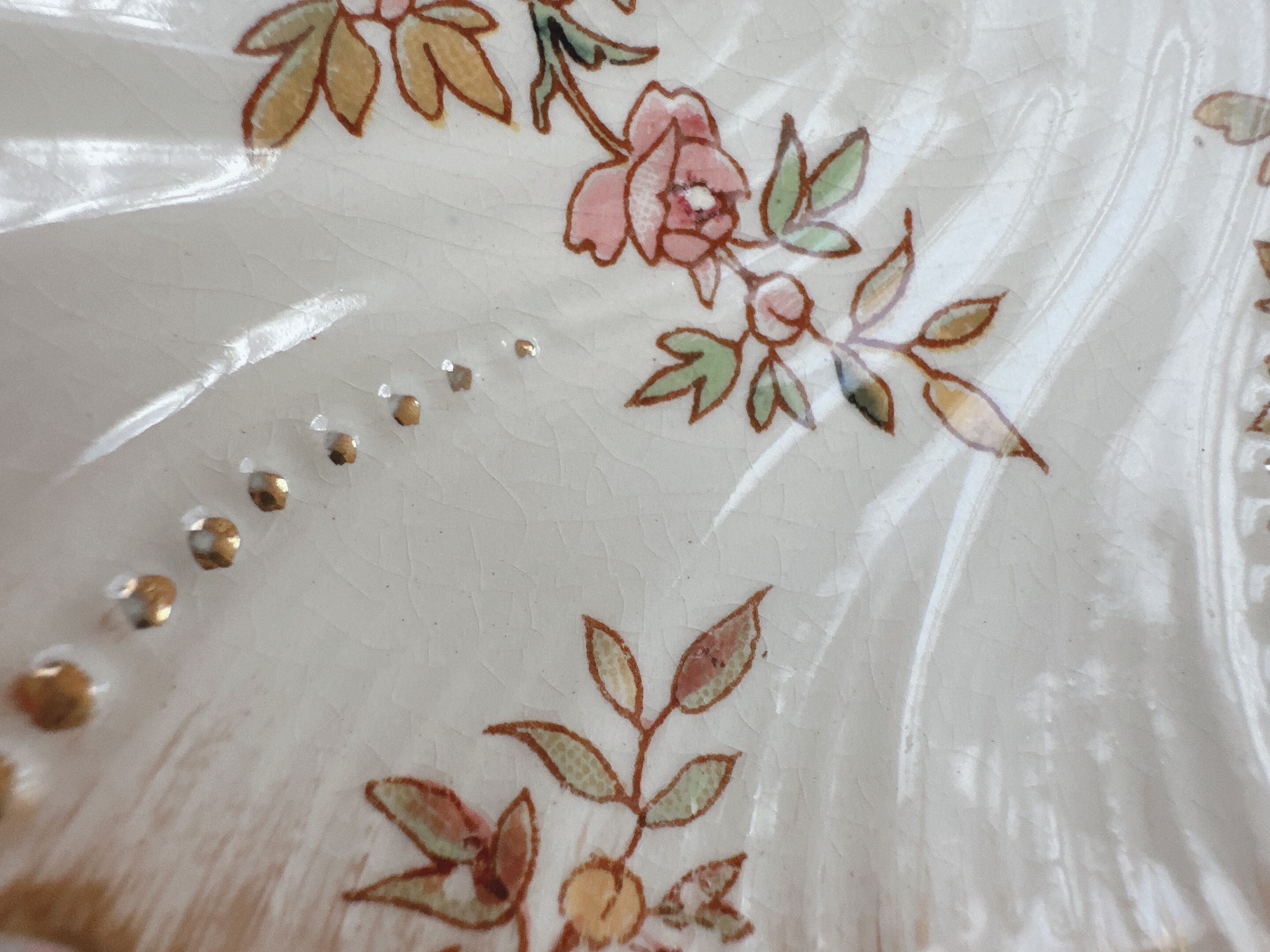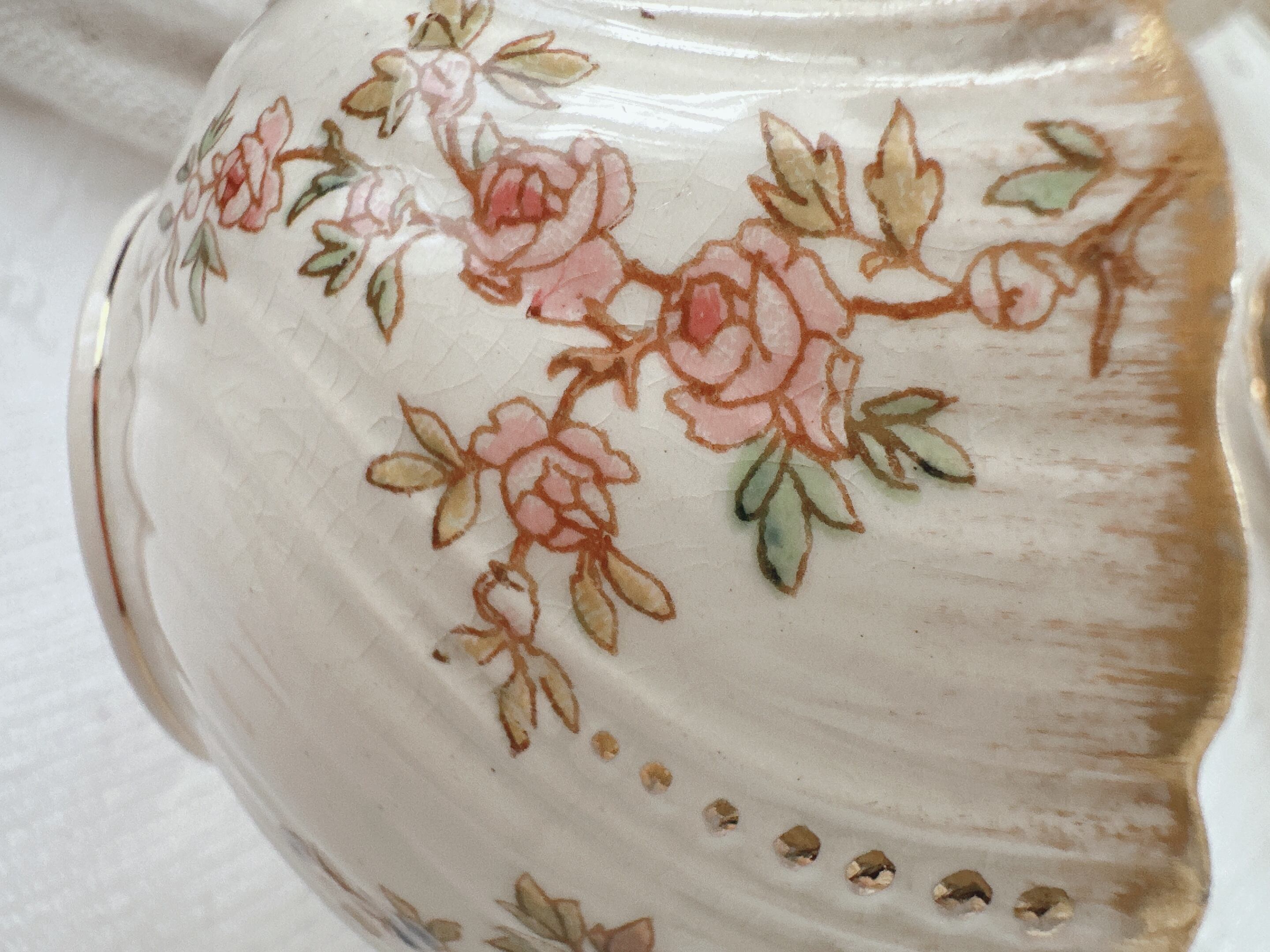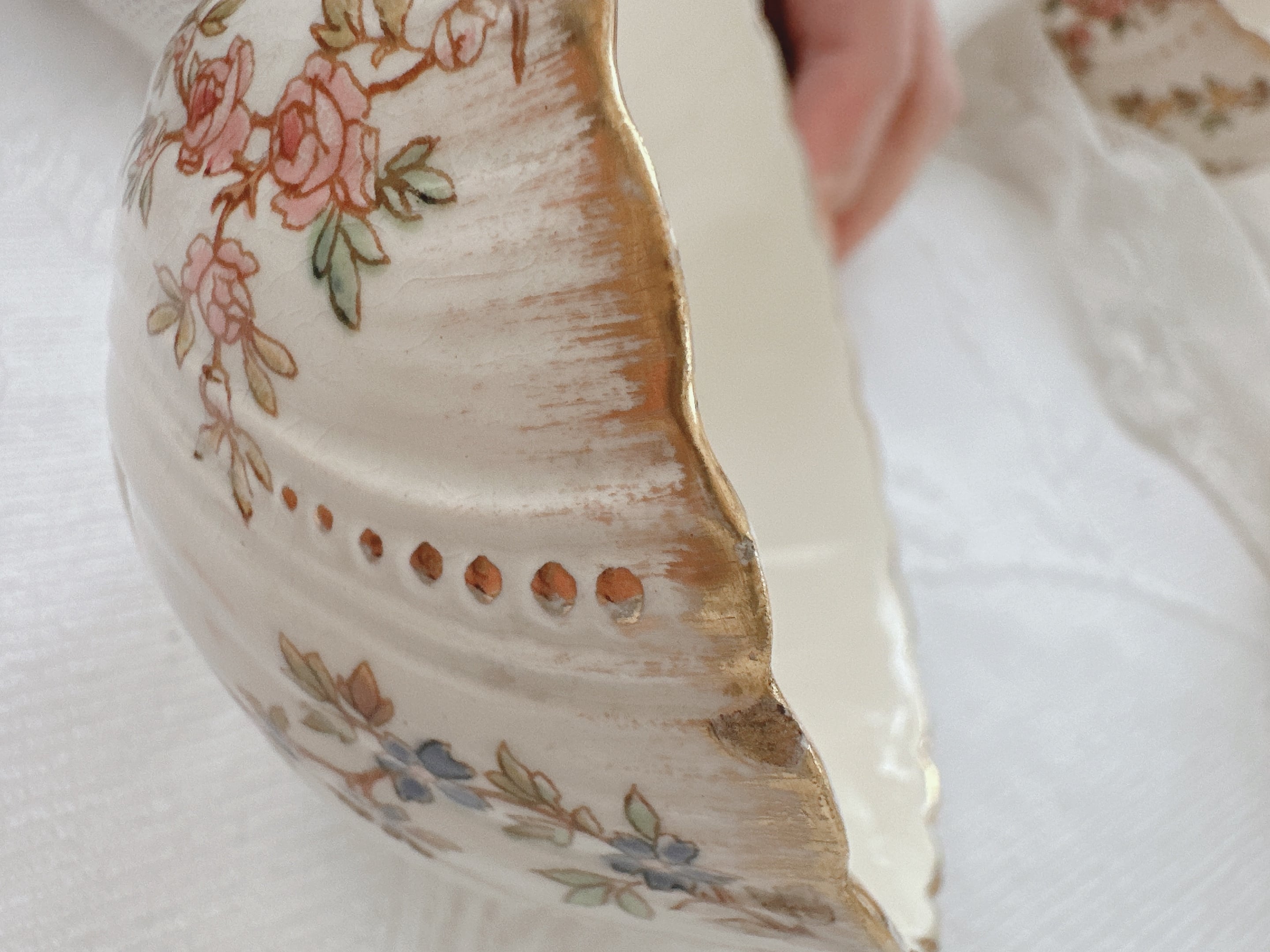 サルグミンヌU&C時代の古いお品。金色の縁取りが煌びやかで、またレリーフも繊細で美しい逸品です。色使いもあたたかで、淡いパステルカラーが多用された"ロココ"スタイルを表しています。可愛らしく女性的で繊細優美な雰囲気は、フランスの貴婦人たちに愛されたルイ15世のスタイルです。