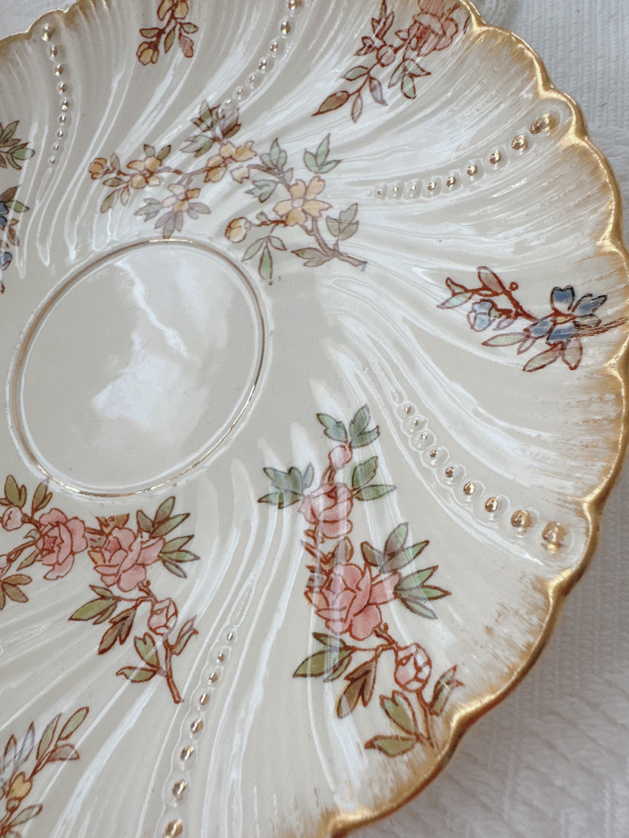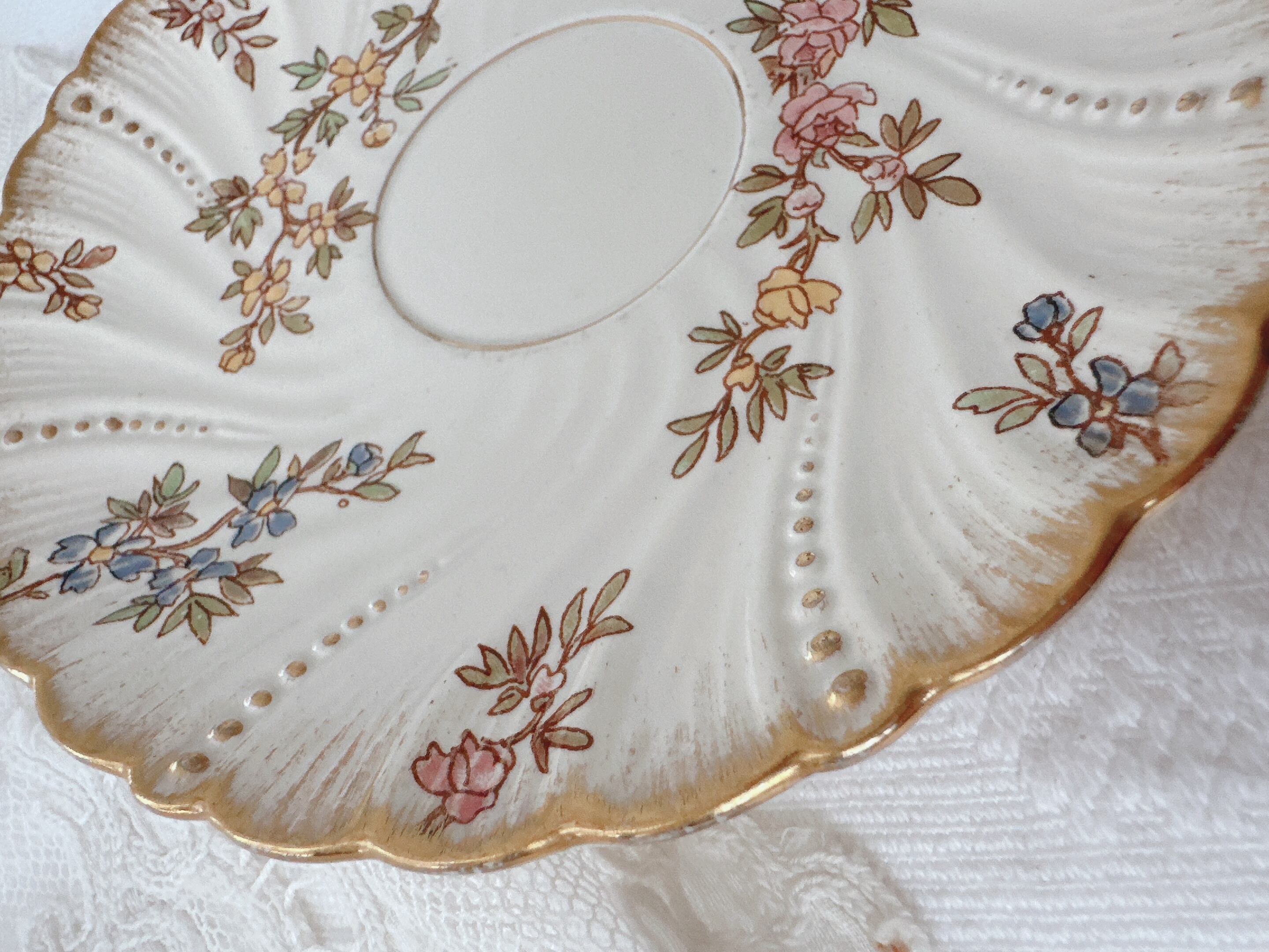 サルグミンヌU&C時代の古いお品。金色の縁取りが煌びやかで、またレリーフも繊細で美しい逸品です。色使いもあたたかで、淡いパステルカラーが多用された"ロココ"スタイルを表しています。可愛らしく女性的で繊細優美な雰囲気は、フランスの貴婦人たちに愛されたルイ15世のスタイルです。