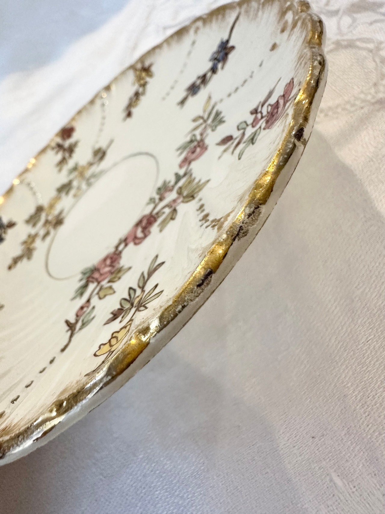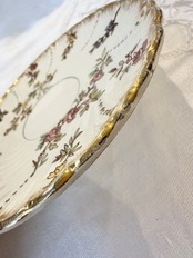 サルグミンヌU&C時代の古いお品。金色の縁取りが煌びやかで、またレリーフも繊細で美しい逸品です。色使いもあたたかで、淡いパステルカラーが多用された"ロココ"スタイルを表しています。可愛らしく女性的で繊細優美な雰囲気は、フランスの貴婦人たちに愛されたルイ15世のスタイルです。